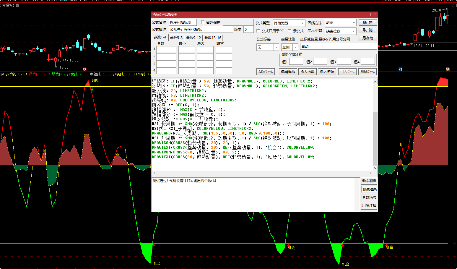 弱势区: IF(趋势动量 < 50, 趋势动量, DRAWNULL), COLORGREEN, LINETHICK2;