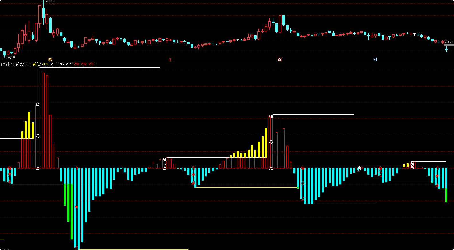 W4:STICKLINE(MACD<0 AND MACD<前低 AND 前低<0,MACD,前低,2,0),COLORGREEN;
