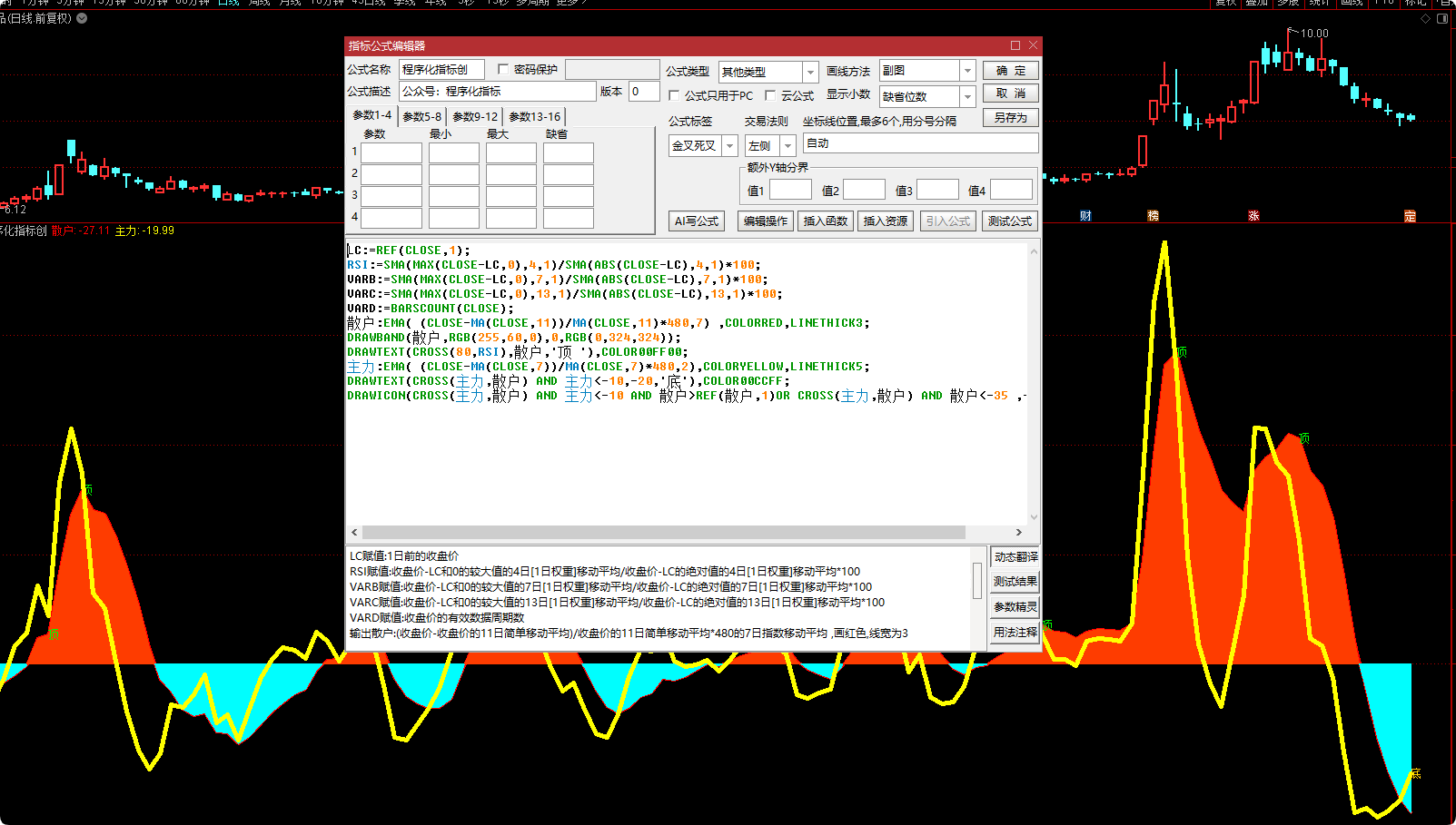 DRAWTEXT(CROSS(主力,散户) AND 主力<-10,-20,'底'),COLOR00CCFF;