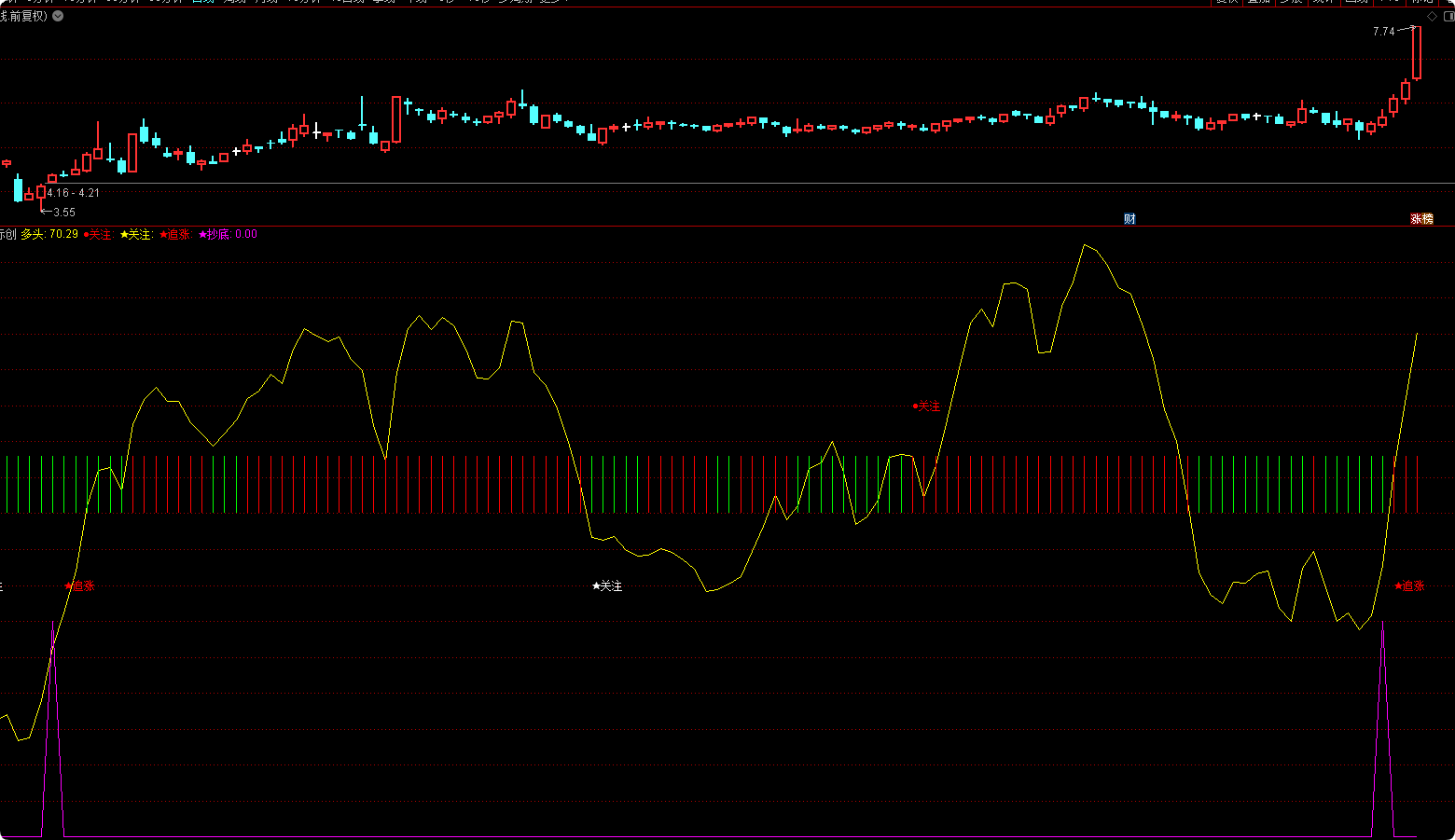 ★追涨: DRAWTEXT(REF(CROSS(多头,慢线),1) AND 多头>1.3*慢线,35,'★追涨'),COLORRED,LINETHICK1;