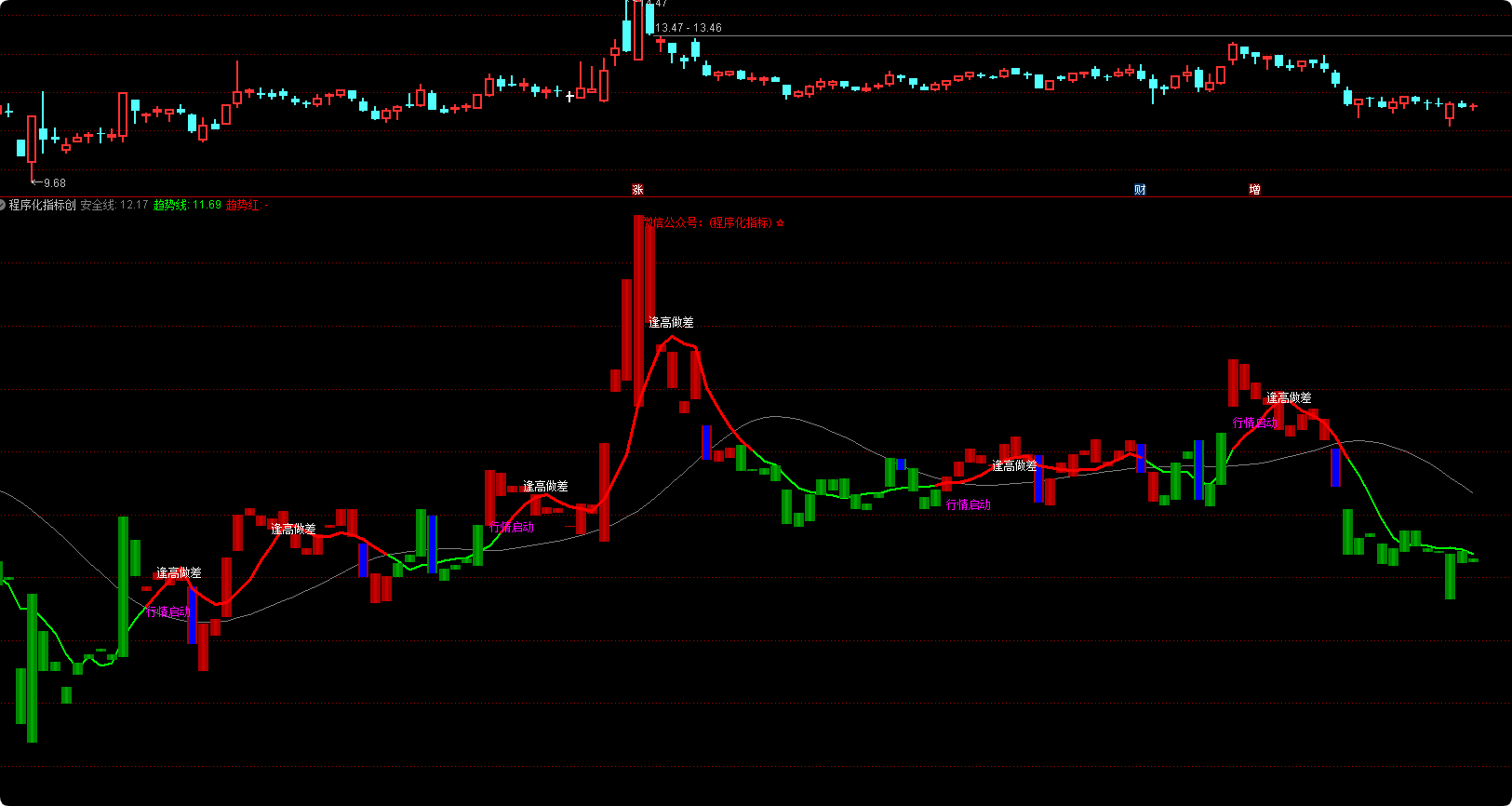 趋势红:IF(趋势线/REF(趋势线,安全线)>1.001,趋势线,DRAWNULL),COLORRED,LINETHICK3;