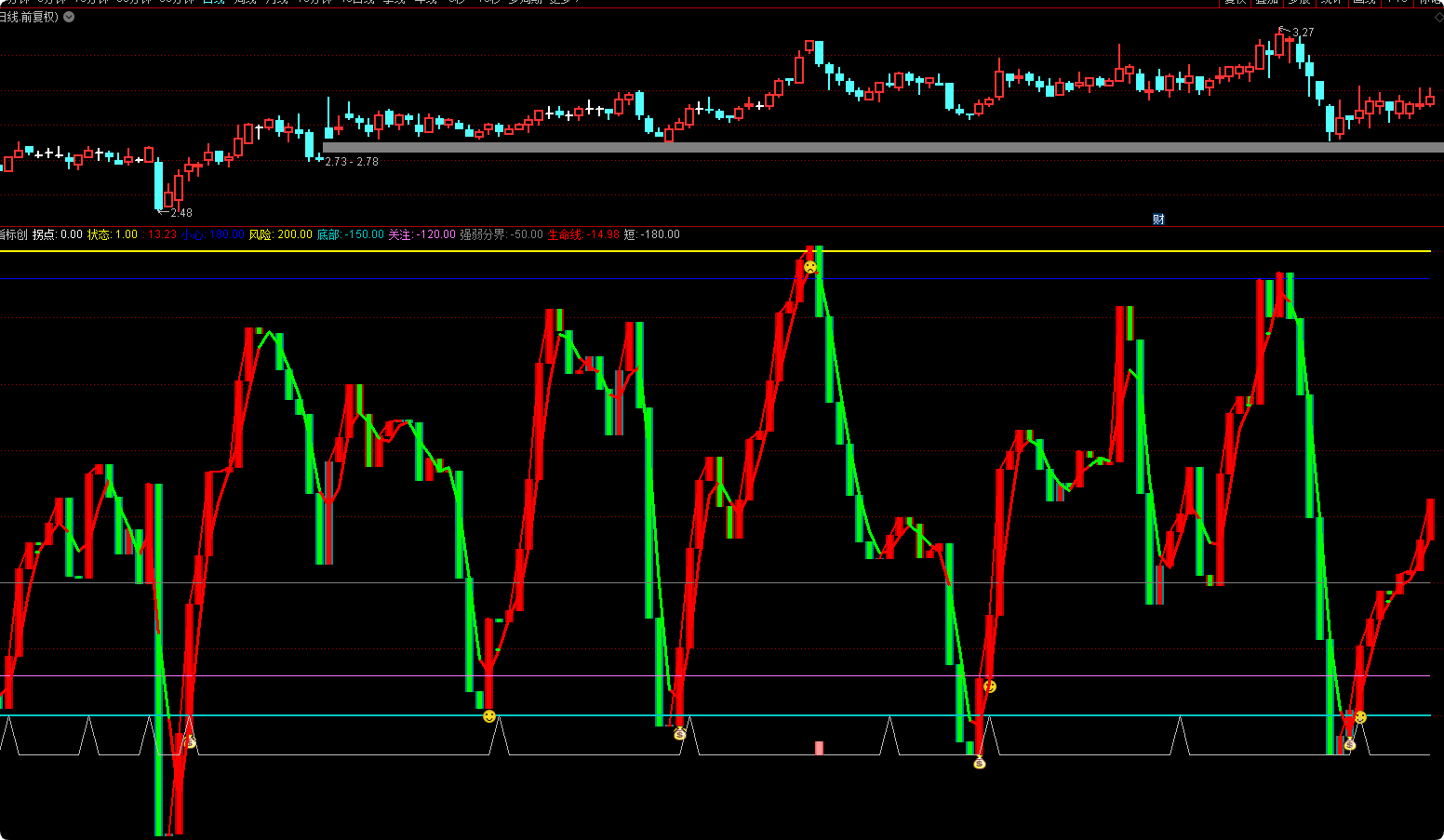 IF(动力线<REF(动力线,2) OR 动力线<=REF(动力线,1),生命线,DRAWNULL),COLORGREEN, LINETHICK3;