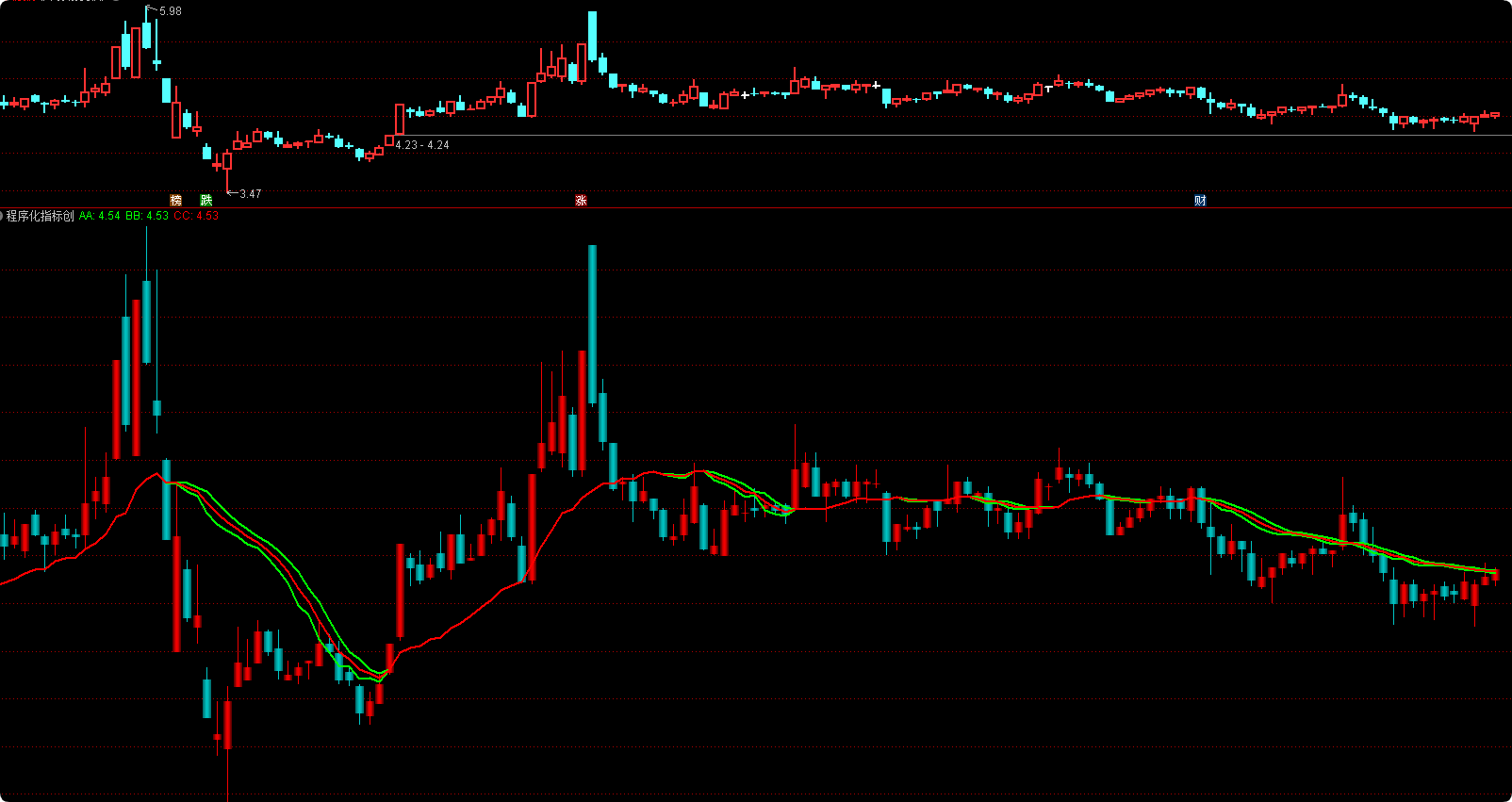 AA:MA(CLOSE,18)+ABS(MA(CLOSE,18)-REF(MA(CLOSE,18),1)),COLORGREEN,LINETHICK2;