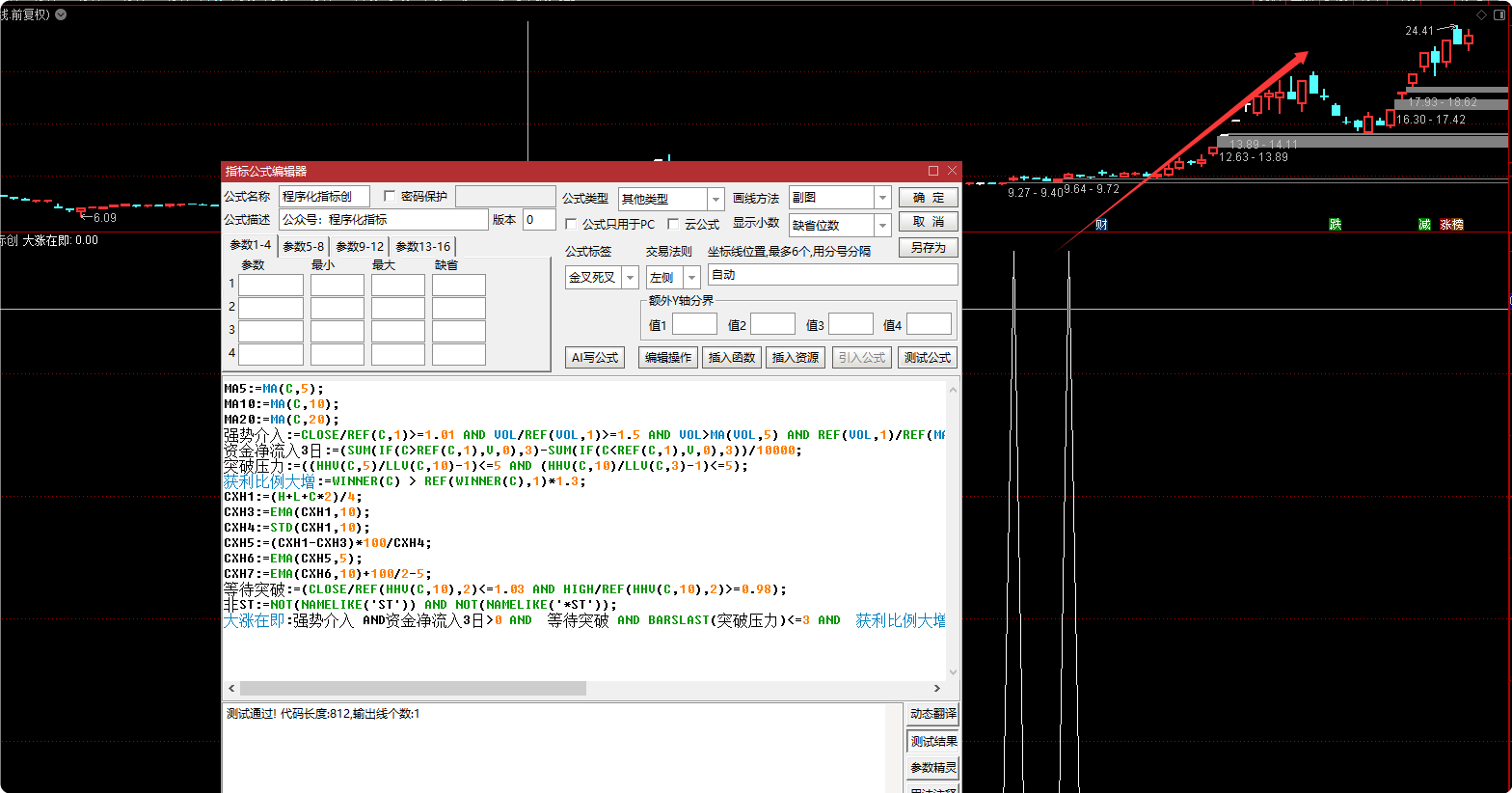 大涨在即:强势介入 AND资金净流入3日>0 AND 等待突破 AND BARSLAST(突破压力)<=3 AND 获利比例大增 AND CXH7> REF(CXH7,1) AND BARSLAST(等待突破)<=1 AND MA5>MA10 AND MA10>MA20 AND 非ST;