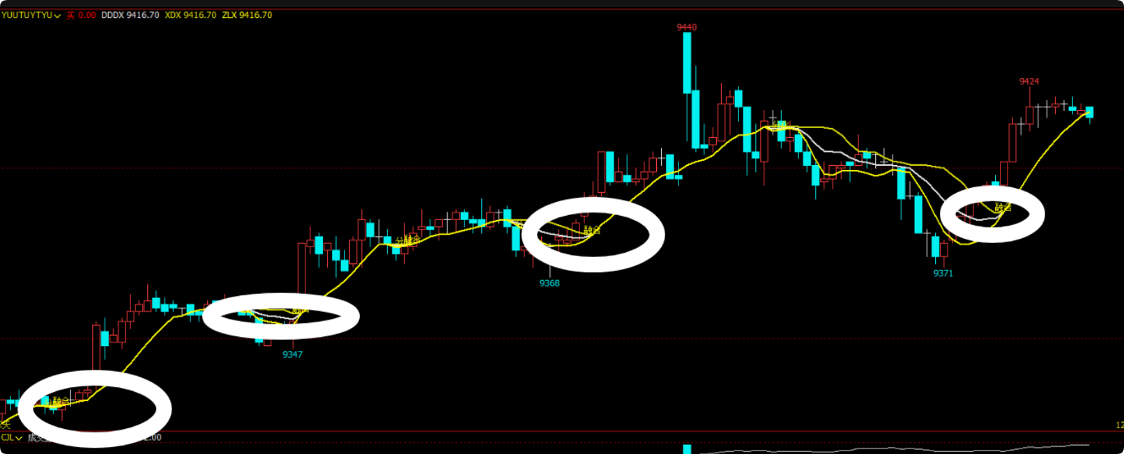 DRAWTEXT(CROSS(ZLX<XDX AND REF(ZLX ,1)<REF( XDX, 1),0.5) ,ZLX, '分化');
