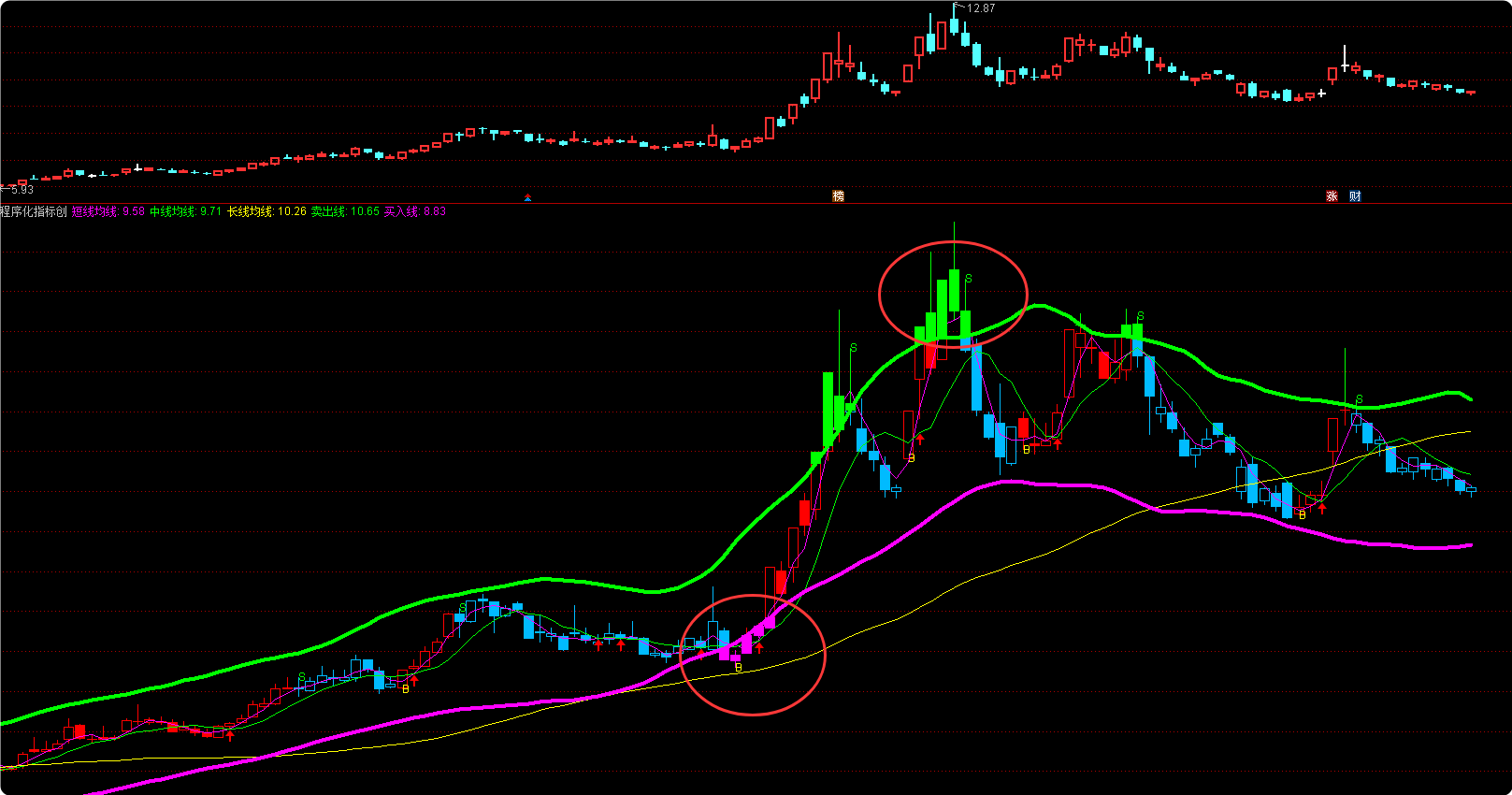 STICKLINE(卖出线>L AND 卖出线MIN(C,O) AND 卖出线L AND 卖出线L AND 买入线MIN(C,O) AND 买入线L AND 买入线H,O,C,3,0),COLORMAGENTA;