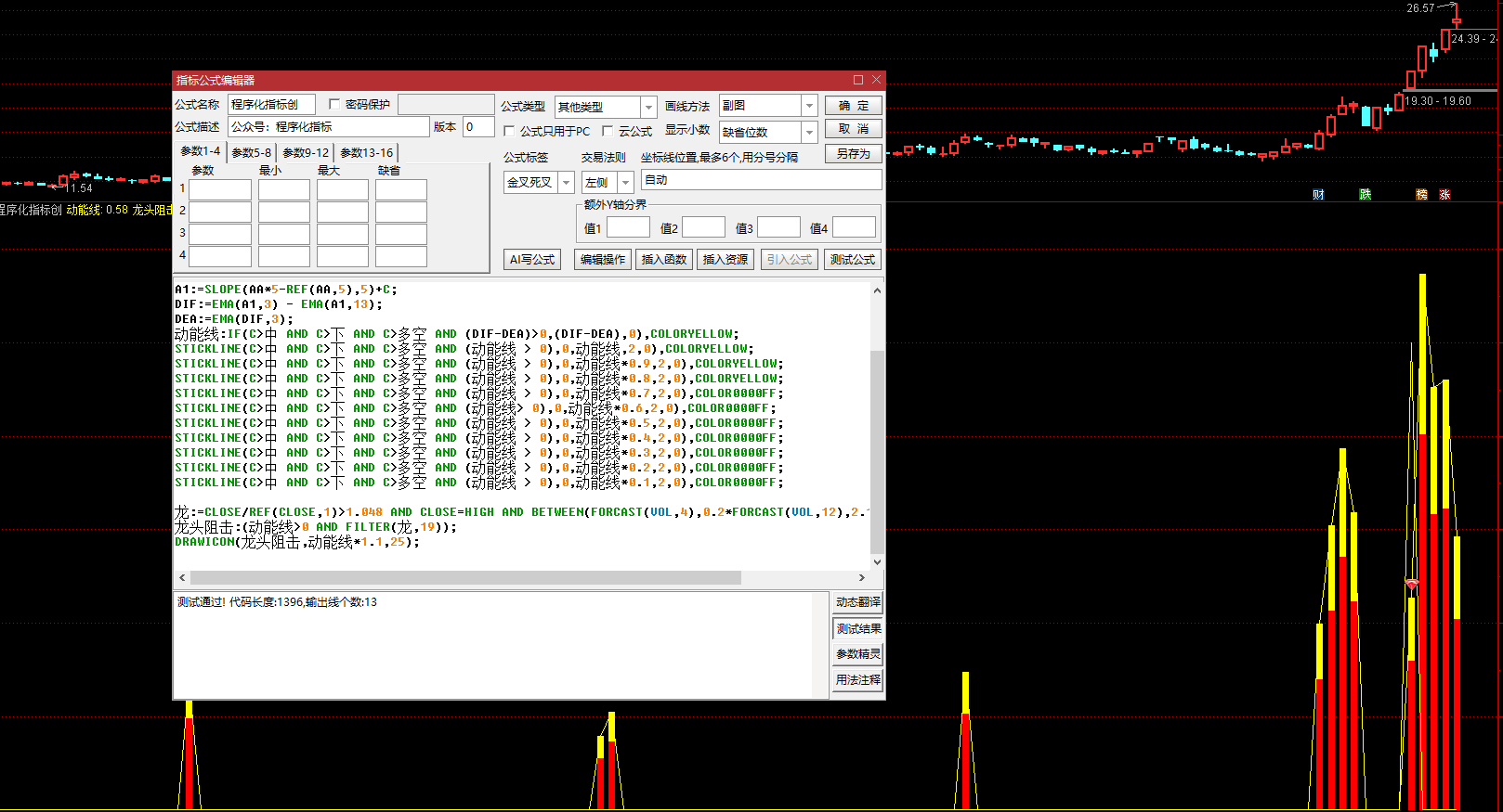 动能线:IF(C>中 AND C>下 AND C>多空 AND (DIF-DEA)>0,(DIF-DEA),0),COLORYELLOW;