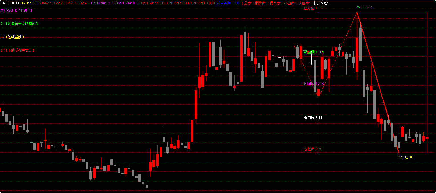 SZHTW4:DRAWLINE(CURRBARSCOUNT=IF(DQD1<DQH1,CONST(DQD2)+1,CONST(DQH2)+1),CONST(HQD1),CURRBARSCOUNT=ISLASTBAR,CONST(HQD1),1),COLORMAGENTA;{画支撑线}