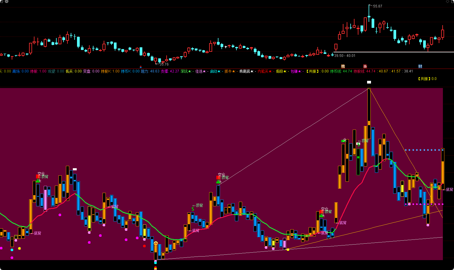 持股线:IF(持币线>REF(持币线,1),持币线,DRAWNULL),COLOR460CF3,LINETHICK3;